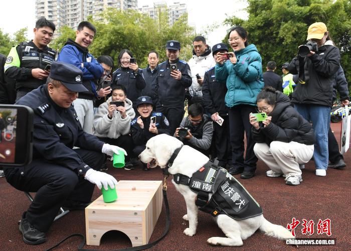 图为举动现场,平易近警取警犬互动引围不雅。中新社记者 周毅 摄