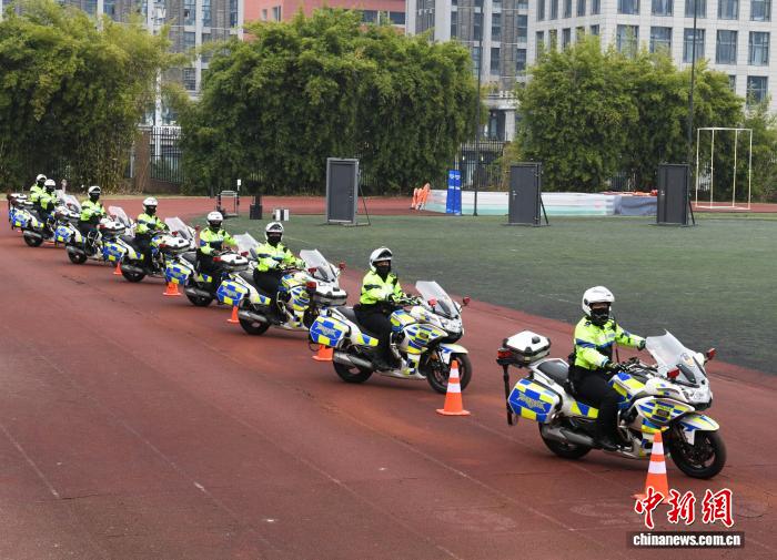 图为举动现场,警用摩托车吸收小教死远间隔体味。中新社记者 周毅 摄